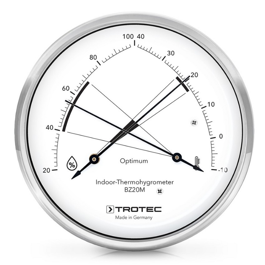 You'll find it hard to find a quicker and simpler way to control indoor climate values. And hardly a prettier solution, either – it is a treat for the eyes... The thermohygrometer BZ20M is surrounded by a high-end stainless steel housing. With a diameter of 130 mm and the special scale design it can be easily read even at a larger distance.