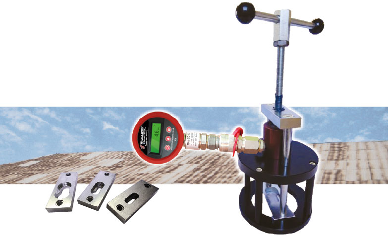 Hydrajaws" Long Stroke Tester determines the strength and suitability of fixings in built-up roofing constructions where performance data is unavailable. The long stroke of 80mm means that once tested the fixing can be completely extracted. The large area of the tester base reduces the pressure on fragile roofing materials to prevent damage. At a load of 10kN the pressure is less than 1N/mm².