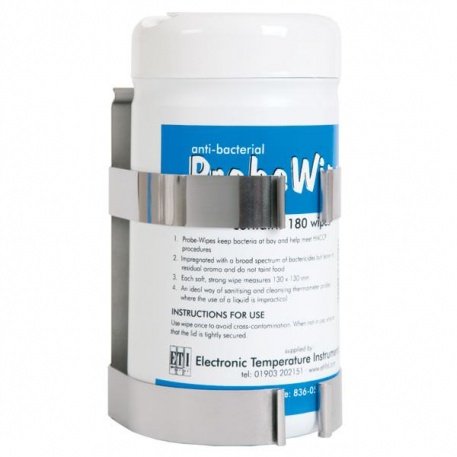 Anti-bacterial Probe Wipes Wall Bracket / Holder - This stainless steel wall bracket is designed for holding our 180 tubs of anti-bacterial Probe-Wipes. They enable a single tub of 180 wipes to be conveniently positioned to dispense wipes at work-stations and counters, or wherever the user requires. The probe wipe holder provides for quick and easy fixing to any wall - anywhere. Screws are not supplied.