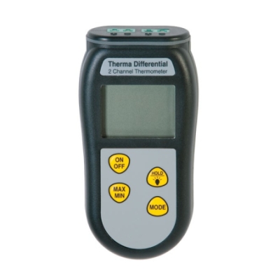 The NEW Therma Differential digital thermometer allows the user to use two type K thermocouple probes simultaneously. The display can be switched to show probe T1 or T2 temperature or the difference between probes T1 and T2 (T1-T2). This allows, for example, the temperature drop across radiators or the temperature rise or fall of two items to be measured.