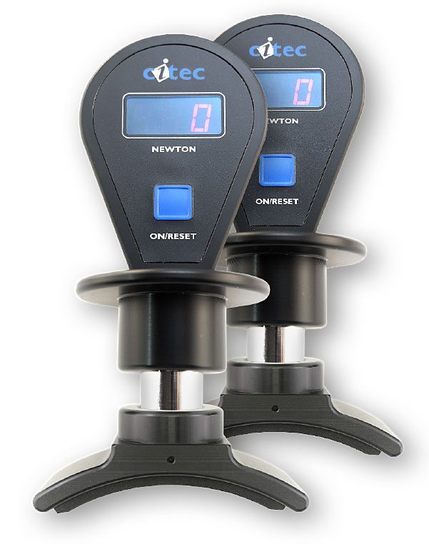 The CT 3002/30, a hand-held precision digital force gauge including 3 standard applicators (roundlarge, roundsmall and flat), batteries (non rechargeable silver oxide, 6.2 V 1 set 2 pieces) manual and working sheets.